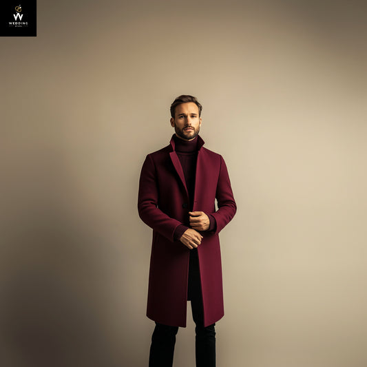 Burgundy Wool Trench Coat – Elegant Men's Winter Overcoat with Peak Lapel